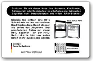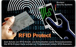 Die RFID Protect Karte schützt Ihre Daten auf Kredit- und Scheckkarten, den Personalausweis oder anderen RFID-Karten gespeicherten persönlichen Daten vor Diebstahl mittels tragbaren RFID-Scannern.